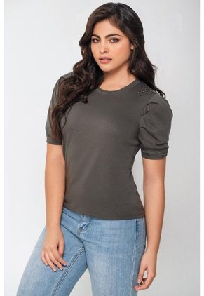 Camiseta con recogido en manga. Detalle de aplique enhombro. Silueta estándarTallas: S - M - L - XLComposición: Algodón-ElastanoColor: VerdeSe venden las blusas, los pantalones y short por separado