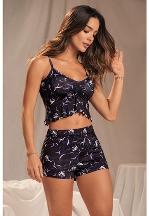 Conjunto de pijama sexy con blusa de tiras ajustables, detalle de bolero y short con cintura elástica Tallas: S - M - L -XL Composición: Microfibra Color: Negro