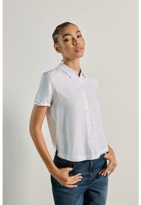Blusa crop top para mujer en tono unicolor cuenta con cuello camisero, cierre delantero con botones, manga corta, dobladillo en puños y una silueta ligeramente ajustada al cuerpo. Atrévete a crear un outfit moderno con esta prenda, combínala con un jean push up y un par de botines, así serás el centro de todas las miradas.