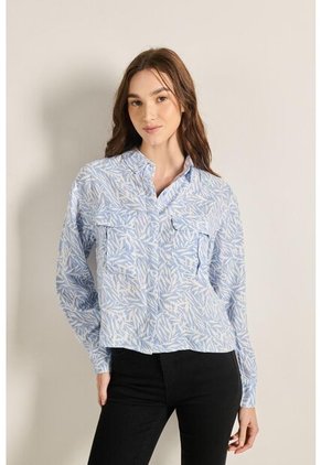 Blusa para mujer crop top unicolor, elaborada en tela viscosa, cuenta con cuello camisero, manga larga, diseños estampados, cierre con botones, doble bolsillo con tapa y un fit ligeramente ajustado. Infaltable en tu guardarropa, podrás lucirla con tus jeans favoritos y crear estilos con los que reflejes tu lado más encantador.