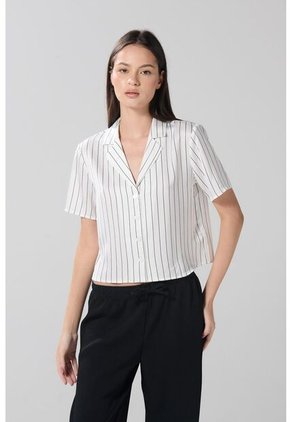 Blusa manga corta para mujer en tono unicolor cuenta con cuello resort, cierre delantero con botones, diseños de rayas en contraste y un fit ligeramente ajustado en el cuerpo. Dale un toque moderno a tu look combinando esta prenda con tus jeans o faldas favoritas, así serás la sensación en todos tus planes.