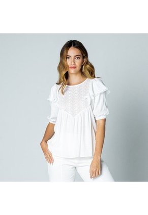 BLUSA ROMANTICA CON MEZCLA DE TELAS Y BOLERO EN MANGA - VISCOSA 95 ELASTANO 5
