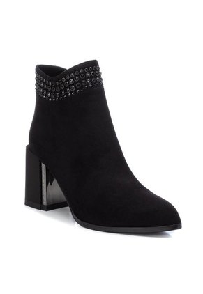 Botín de mujer, de la marca Xti. Fabricado en suave antelina. Cierre mediante cremallera lateral. Detalle de piedras de fantasía al tono en la caña. Tacón ancho de 8 cm con suela antideslizante. Un modelo ideal que vestirá cualquier look. Este modelo ha obtenido el certificado vegano por la organización mundial PETA (Organización de los derechos de los animales).