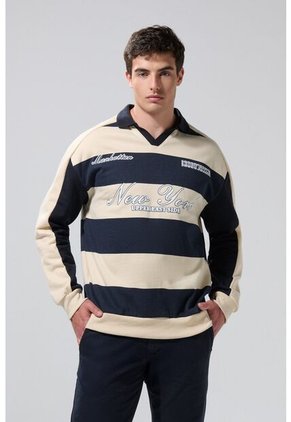Buzo kaki claro para hombre cuenta con diseño college en frente, puños y ruedo tejidos en rib, rayas en contraste, cuello tipo polo, cierre con botones en pechera, manga larga y un fit oversize. ¡Esta prenda tiene un estilo moderno que te encantará! Combínala con un jean baggy y lúcela en un plan casual con amigos.