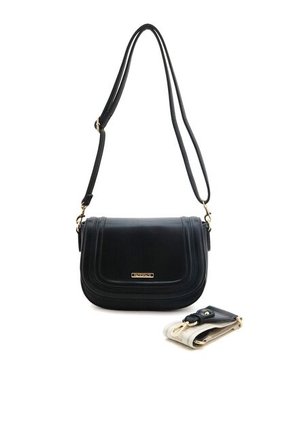 Bandolera pequeña en forma de media luna con tapa frontal y placa delantera, con dos cargaderas una largar ajustable removible y otra tejida para uso según gusto, con bolsillo interno y cierres metalicos, elaborada en sintetico con textura lisa y forro interno en tela,garantía de tres meses directamente con el vendedor en cierres, despegados y herrajes