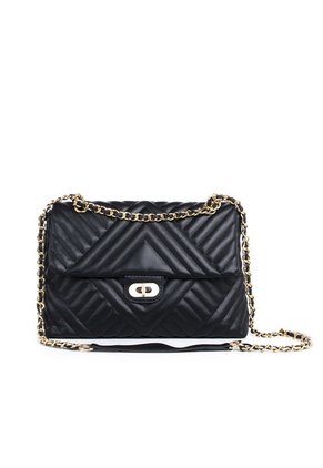 Bandolera color negro, para dama. Su diseño cuenta con un bolsillo con cierre, una tapa texturizada con imán y cargaderas estilo cadena. Perfecta para ser usada en estilos juveniles