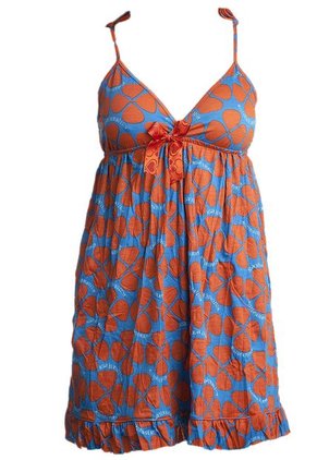 Batola Historia de Amor color naranja y azul, elaborada en poliéster, escote triangular con tiras delgadas de hombro que se amarra en la parte superior, en el centro del busto lleva una tira decorativa otorgando un toque diferente, con dobladillo inferior de vuelos para mayor movimiento. Es una batola corta que llega mas arriba de la rodilla. El estampado posee unas figuras florales de fondo azul para excelente contraste y toque súper femenino.