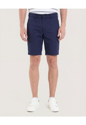 Bermuda para hombre. Largo por encima de la rodilla. Cierre frontal con botón y cremallera. Bolsillos tipo parche al frente que aportan un look funcional. Bolsillos posteriores de diseño limpio. Silueta regular con ajuste cómodo. Ideal para looks casuales y climas cálidos.Especificaciones:Color: AzulComposición: 59% Algodón 38% Poliéster 3% ElastanoFit: RegularInstrucciones de Lavado:No dejar en remojoLavar en agua fría separadamenteNo usar blanqueadorNo retorcerSecar a la SombraPlancha tibiaHecho en ColombiaGarantía: 30 Días.