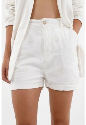 ¡Los mejores looks del verano ya llegaron a Topmark! Esta bermuda será tu complemento perfecto para las tardes más soleadas. Características- Color: crudo - Ajuste de cierre y botón - Bolsillos diagonales en frente - Prenses en frente - Guardapolvo en ruedo - Bordado de conchas marinas tono a tono - Forrada - Material: Algodón 100% Sobre el fit Combínala con su blazer en set y eleva el look con accesorios.