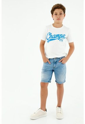 Un básico para el armario de tu pequeño que combina con todo. Esta bermuda de jean con rotos localizados es una pieza fundamental para crear un look casual, moderno y por supuesto, muy cómodo. Características-Color: azul-Material: 86% Algodón / 12% Poliéster / 2% Elastano-Silueta nudy-Pretina con botón-Bolsillos-Rotos localizados Sobre el fitEsta bermuda es de silueta recta y ajustada, con cierre y botón frontal. Cuenta con bolsillos amplios y cómodos para que tu pequeño guarde sus pertenencias. La mejor combinación es una camiseta básica y unos tenis deportivos.