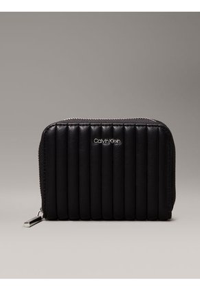 Esta mini billetera con línea acolchada de tamaño mediano tiene un diseño elegante y funcional. Su cierre alrededor con cremallera te permite abrir y cerrar la billetera con facilidad, mientras que el patrón acolchado le da un toque moderno y sofisticado. Ideal para llevar lo esencial de forma compacta, esta billetera es perfecta para un look de día o noche.Características• Exterior de cuero sintético suave• 4 ranuras para tarjetas, 2 ranuras de seguridad, billetero y bolsillo monedero• Acolchado de rayas con relleno• Al: 10 cm, L: 12,5 cm y An: 2,5 cm• Logo de metal plateado de Calvin Klein en la parte delanteraComposición y cuidados• 100% Poliuretano• Solo limpieza en seco