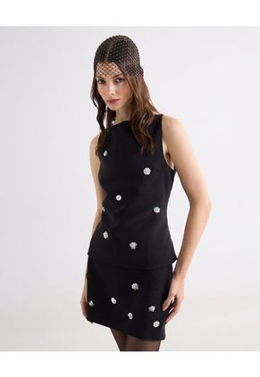 Blusa sin mangas con delicados apliques brillantes. Su diseño moderno y femenino la convierte en una prenda ideal para elevar cualquier look. ¡Haz tu pedido ahora!Especificaciones:Color: NegroComposición: Poliéster 95% Elastano 5%Tipo de cuello: Cuello RedondoTipo de manga: Sin MangasInstrucciones de Lavado:No dejar en remojoLavar en agua fría separadamenteNo usar blanqueadorNo retorcerSecar a la SombraPlancha tibiaHecho en ColombiaGarantía: 30 Días.