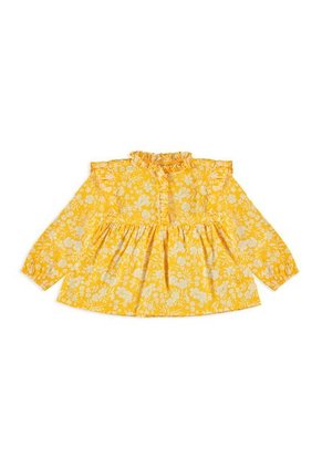 Blusa de Bebe Niña manga larga estampada de flores en tono amarillo y beige arandela decorativa a tono en cuello, puños y abotonadura una prenda casual infaltable en tu armario