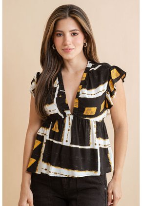 Blusa en chalis estampado, escote en V con elástico, manga corta bolero. RAGGED es una empresa competitiva y sólida que cuenta con más de 30 años de experiencia con su propuesta de diseño y moda,_x000d_ comprometida con su misión de vestir a la mujer en sus diferentes estilos de vida resaltando su esencia femenina._x000d_ Su compromiso con la mujer, la clara definición de las líneas de vestuario y los productos que satisfacen los deseos de la mujer llevan a RAGGED_x000d_ a poner en sus puntos de venta colecciones renovadas semanalmente, logrando así una presencia altamente competitiva entre las marcas internacionales.