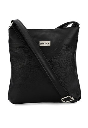 Bolso manos libres Negro macoly, elaborado en sintético (poliuretano), diseño casual con textura de grabada. Detalles alusivos a la marca y finas costuras visibles. Tiene compartimiento con bolsillo interno, bolsillo posterior con