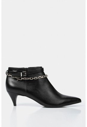 Nuestros botines de cuero de altura media son versátiles gracias a su cadena y correa con hebilla ajustable que permite diversos usos. Esta silueta de tacón puntilla es ideal para looks casuales y formales muy frescos.