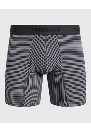 Calzado para hombre tipo bóxer de silueta larga,Diseño en base de color negro con un patrón continuo de rayas finas horizontales en contraste blanco,Pretina elástica ancha en color negro sólido que asegura un ajuste firme a la cintura,Incorpora el nombre de la marca "PATPRIMO" en tejido de jacquard sobre la banda elástica,Confeccionado con paneles ergonómicos frontales delimitados por costuras reforzadas para un soporte superior,Tejido elástico que permite una total libertad de movimiento durante el uso diario,Terminación de las piernas con dobladillo elástico para evitar que la prenda se desplaceEspecificaciones:Color: GrisComposición: Tela Primaria:64% Poliamida 27% Elastano 9% PoliésterPaquetes: X1Instrucciones de Lavado:No dejar en remojoLavar en agua fría separadamenteNo usar blanqueadorNo retorcerSecar a la SombraPlancha tibiaHecho en ColombiaGarantía: 15 Días.