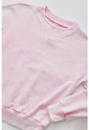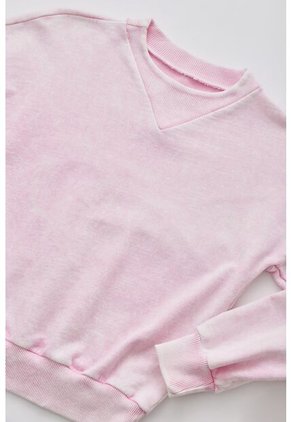¡La mejor combinación! Los días fríos ahora estarán llenos de magia y confort. Características- Color: rosado - Manga larga - Cuello en triángulo - Cuello y puños en rib - Teñido desgastado - Material: Algodón 98% Elastano 2% Sobre el fit Ideal para lucir con tus jeans favoritos y crear un look equilibrado durante el invierno.