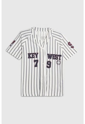 Camiseta manga corta crema clara para niño cuenta con cierre delantero con botones, rayas continuas en contraste, cuello V, diseños college y una horma oversize en el cuerpo. ¡Esta es la prenda perfecta para completar tus looks diarios! Combínala con un jean cargo y luce renovado.