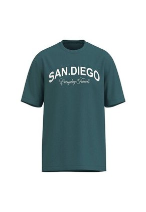 Camiseta manga corta unicolor para hombre, en algodón, silueta holgada, hombro rodado, con estampado localizado estilo College en el frente. Vive tu día a día con un espíritu universitario.