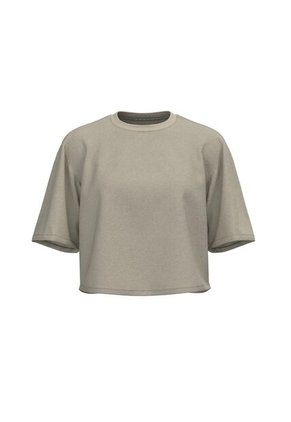 Camiseta kaki clara crop top para mujer, elaborada en tela de algodón, cuenta con hombro caído, manga corta amplia, cuello redondo y una silueta oversize en el cuerpo. Entra en la onda streetwear combinando esta prenda con tus jeans anchos favoritos, así lucirás a la moda en tus planes más descomplicados.