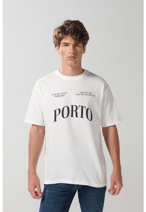 Camiseta manga corta para hombre en tono crema clara, confeccionada en tela de algodón, cuenta con hombro rodado, cuello redondo, estampado college y un fit ligeramente ajustado. Esta prenda será la opción ideal para crear looks casuales. ¡Con un jean o una bermuda lucirás sensacional!