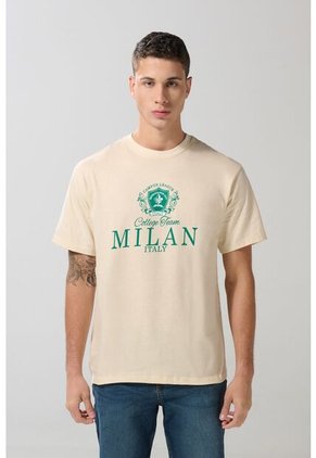 Camiseta para hombre manga corta kaki clara cuenta con diseño de texto college estampado en frente, cuello redondo, hombro rodado y un fit ligeramente ajustado al cuerpo. ¡Esta prenda será perfecta para todos tus planes! Combínala con un jean skinny y dale un toque moderno a tu estilo.