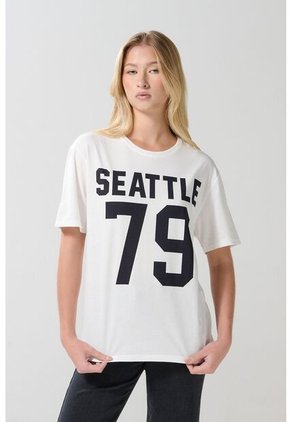 Camiseta manga corta para mujer en tono crema clara, elaborada en tela de algodón, cuenta con hombro rodado, cuello redondo, diseño college localizado en frente y una silueta holgada en el cuerpo. Completa tu propia colección con esta prenda, podrás usarla en tus planes diarios con tus jeans preferidos.