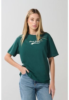 Camiseta cuello redondo para mujer en tono verde intensa cuenta con hombro rodado, manga corta, diseño college en frente y una silueta holgada en el cuerpo. ¡Esta prenda será la mejor opción para crear tu total look! Combínala con tus faldas KOAJ favoritas y lleva tu estilo a tus salidas casuales con amigos.