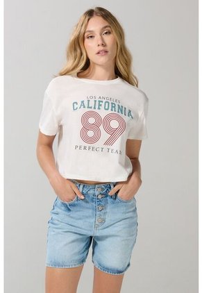 Camiseta crema clara crop top para mujer cuenta con manga corta, cuello redondo, diseño college numérico localizado en frente y una silueta ligeramente ajustada en el cuerpo. Crea un estilo renovado con esta prenda, un clásico que combinará muy bien con tus jeans, shorts o faldas favoritas.