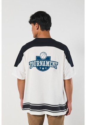 Camiseta manga corta para hombre en tono crema clara cuenta con hombros en contraste, diseños college en frente y espalda, cuello redondo y un fit oversize en el cuerpo. Esta prenda te brindará el estilo urbano que necesitas para sentirte auténtico en tus planes más descomplicados.