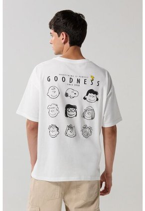 Camiseta manga corta para hombre en tono crema clara cuenta con diseños de Snoopy en frente y espalda, cuello redondo, hombro caído y una silueta oversize en el cuerpo. Completa tu propia colección con esta prenda, podrás usarla en tus planes diarios con tus jeans anchos preferidos.