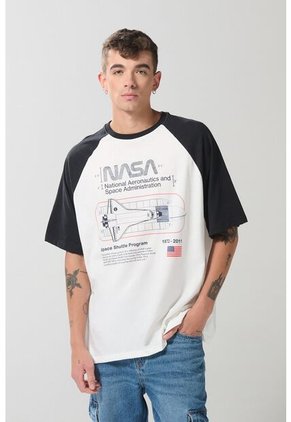 Camiseta crema clara para hombre cuenta con manga ranglan corta en contraste, cuello redondo, diseño de NASA localizado en frente y una silueta holgada en el cuerpo. Luce al mejor estilo espacial combinando esta prenda con un jean slim y un par de tenis planos. ¡Te verás genial en tus planes diarios!