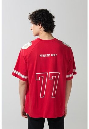 Camiseta masculina manga ranglan con moderno estampado tipo college para que puedas crear looks muy cool.
