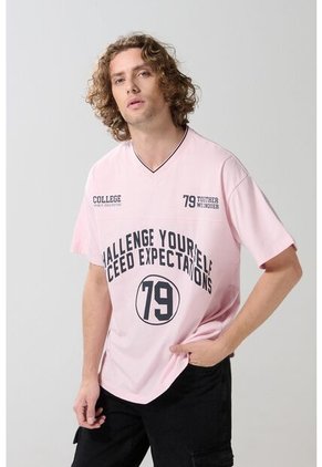 Camiseta unicolor para hombre cuenta con cuello V en rectilíneo, manga corta, diseño college estampado en frente, detalle con corte delantero y un fit oversize en el cuerpo. Refleja la mejor versión de ti en tu look combinando esta prenda con un jean cargo, así disfrutarás con estilo de tus planes.