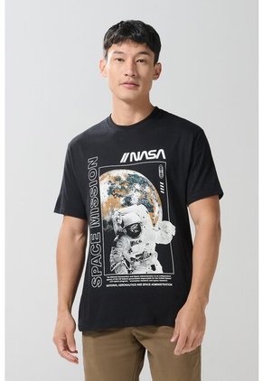 Camiseta para hombre cuello redondo negra cuenta con hombro rodado, estampado de NASA localizado en frente, manga corta y un fit ligeramente ajustado al cuerpo. Esta prenda te brindará el estilo espacial que necesitas para sentirte auténtico cualquier día de la semana. ¡Con jeans o bermudas serás la sensación!