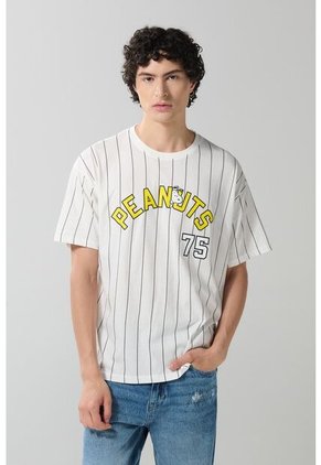 Camiseta crema clara manga corta para hombre cuenta con motivos de rayas en contraste, diseño de Snoopy, cuello redondo, hombro caído y un fit oversize en el cuerpo. Esta es una prenda fácil de combinar que debes tener, con un jean cargo crearás un estilo ideal para iniciar una nueva aventura.