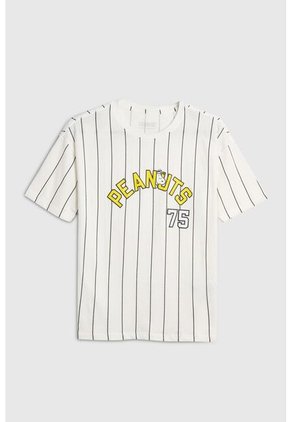 Camiseta para niño manga corta crema clara cuenta con diseño de Snoopy en frente, rayas continuas en contraste, hombro caído, cuello redondo y una horma oversize. Perfecta para una tarde con amigos, podrás combinarla con tu mejor jean KOAJ y crear un atuendo divertido.