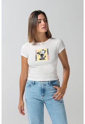 Camiseta para mujer manga corta con cuello redondo con estampado en frente de Felix el Gato. Hecha en rib, silueta ajustada. una prenda que complementara cada uno de tus outfits y podrás usarla para tus planes casuales.