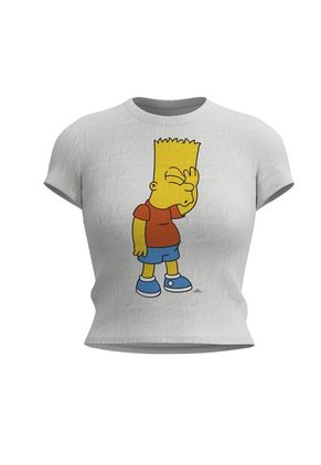 Camiseta manga corta para mujer en tono crema clara, elaborada en tela de rib texturizada, cuenta con diseño en frente de Bart (Los Simpson), cuello redondo y una silueta ceñida al cuerpo. Dale un toque simpsonizado a tu total look combinando esta prenda con faldas o jeans. ¡Serás la sensación!