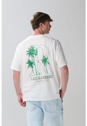 Camiseta manga corta para hombre en tono crema clara cuenta con diseños de playa en frente y espalda, cuello redondo, hombro caído y una silueta oversize en el cuerpo. Deja que la onda streetwear se refleje en tu total look con esta prenda, combínala con una bermuda en jean y luce fenomenal en tus planes más descomplicados.