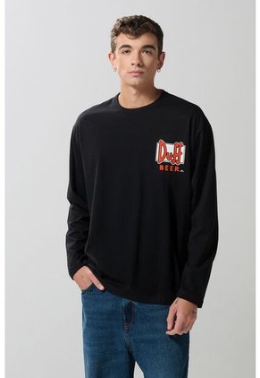Camiseta negra manga larga para hombre cuenta con cuello redondo, hombro rodado, diseño de Duff (Los Simpson) localizado en frente y una silueta holgada en el cuerpo. Haz que tu estilo vibre con esta prenda, combínala con jeans o joggers y crea looks con los que marques la diferencia en todo momento.