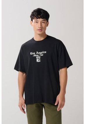 Camiseta manga corta negra para hombre, confeccionada en algodón, cuenta con diseños college en frente y espalda, hombro caído, cuello redondo y una horma oversize en el cuerpo. Innova con tu look combinando esta prenda con un jean cargo y un par de tenis planos, así te destacarás en todo momento.