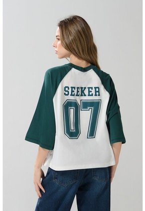 Camiseta crema clara crop top para mujer cuenta con manga ranglan corta en contraste, cuello V, diseños de Harry Potter localizados y una silueta oversize en el cuerpo. Esta es una prenda mágica y atemporal que te encantará, combínala con tu jean favorito y luce siempre la mejor versión de ti.