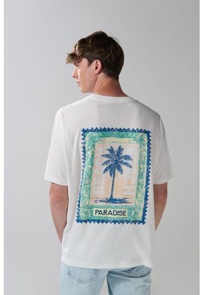 Camiseta cuello redondo para hombre en tono crema clara cuenta con diseños de playa en frente y espalda, hombro caído, manga corta y una silueta oversize. Crea un look fresco y moderno con esta prenda, combínala con una bermuda en jean y luce auténtico en tus planes de fin de semana.