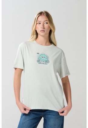 Camiseta verde clara cuello redondo para mujer cuenta con diseño de The Mandalorian (Star Wars) en frente, manga corta, hombro rodado y una silueta ligeramente ajustada. Con esta prenda te destacarás en todo momento y lugar. ¡Combínala con un jean baggy y róbate más de un suspiro!