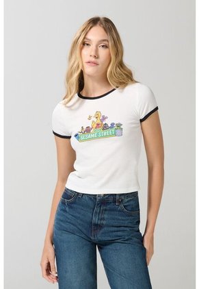 Camiseta crema clara para mujer cuenta con contrastes negros en puños y cuello redondo, manga corta, diseño de Plaza Sésamo localizado en frente y una silueta ajustada al cuerpo. Dale un balance perfecto a tu look combinándola con una falda y un par de tenis altos. ¡Lucirás fantástica en todo momento!