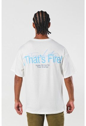 Camiseta para hombre manga corta crema clara, elaborada en tela de algodón y con un fit oversize, cuenta con textos en frente y espalda, cuello redondo y hombro caído. ¿Buscas renovar tu estilo? ¡Esta es la prenda perfecta para hacerlo! Lúcela con un jean cargo y crea un look con esencia streetwear.