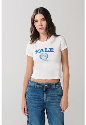 Camiseta para mujer manga corta con cuello redondo con estampado en frente de Yale. Hecha en rib, silueta ajustada. una prenda que complementara cada uno de tus outfits y podrás usarla para tus planes casuales.