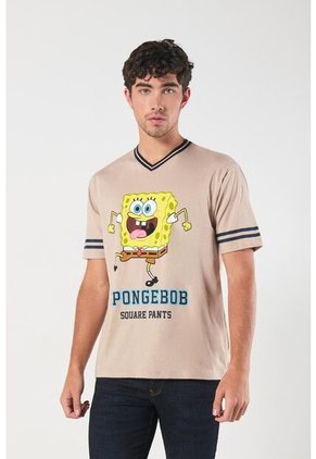 Camiseta kaki clara cuello V para hombre cuenta con diseño en frente de Bob Esponja, manga corta con franjas en contraste y un fit ligeramente ajustado al cuerpo. Arma un look muy cool combinando esta prenda con tus jeans Koaj favoritos. ¡Te destacarás todos los días con tu estilo!